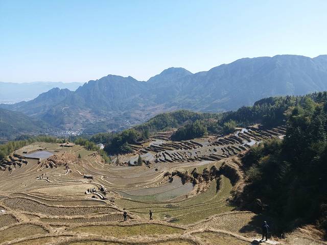 流水正在灌溉梯田,一级一级往下,慢慢地唤醒大地。远处已经有农民带着耕牛开始劳作了,凭添一些野趣,又让人觉得有一种一年之计在于春的生机勃勃。让人的心情也跟着好起来。