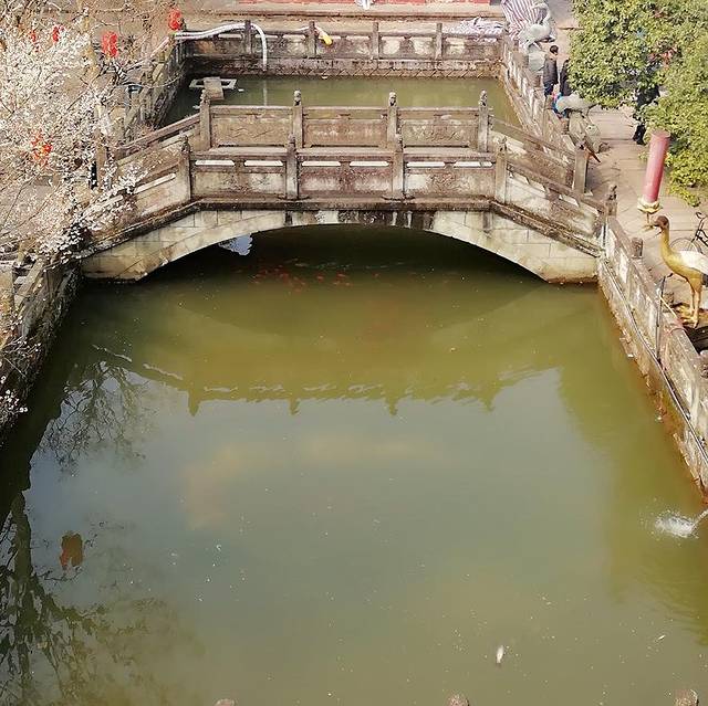 寺内放生池内,养有锦鲤与长寿龟,池底铺满了一层许愿币,闪闪发亮。池的周围有一排排栩栩如生的雕塑,都是寓意着吉祥的动物。园内栽满了植物,恰逢梅花季节,确未能凌寒独自开,两颗桂花树与之争艳,别有一番神奇。