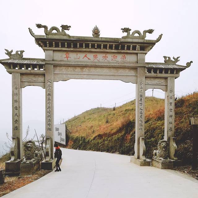 到达山巅,群山已在我们脚下,前方映入眼帘的是“阜山人民欢迎您”的牌坊,边上设“眺云亭”,顾名思义是看云海的有利位置。牌坊与凉亭中间,树旅游导航牌,“浙江福地”四字彰显夺目。其上介绍,乡内除清真禅寺外,有北斗七星墩、明清古建筑、千年古道、层层梯田、百丈瀑布等,因此次行程安排较紧,顿觉惋惜。