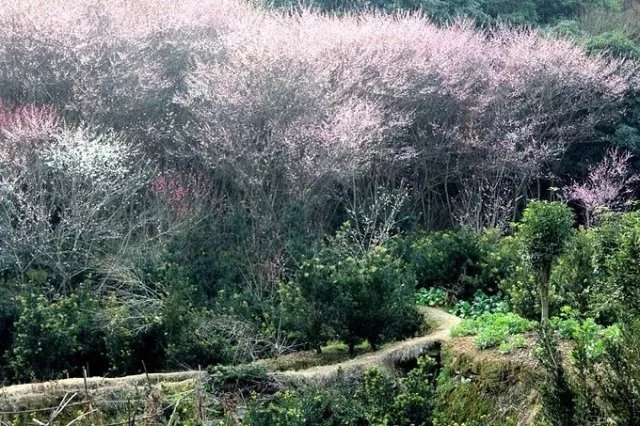 每年3、4月份,山坡上随处可见一丛丛一簇簇开满白色的或粉红的花朵;油菜虽然一片青绿,但间或有一些也绽开金黄色的花蕊,空气中弥漫着一股淡淡的花香。