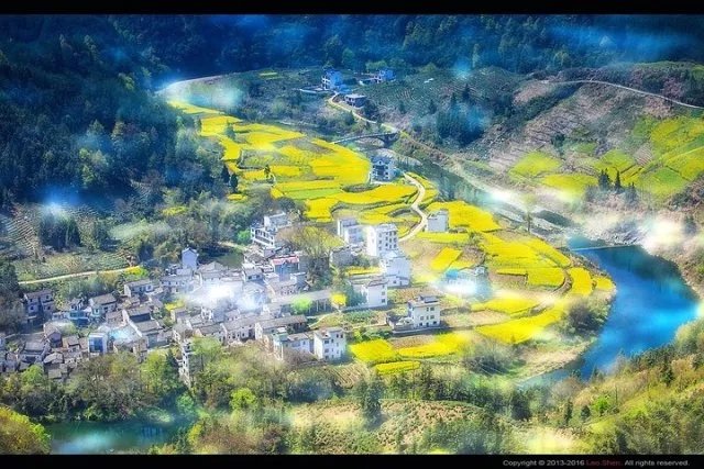 灵山村位于呈坎东南,居于灵金山、丰山之间的山谷内,每年的3月份,黑白调古村落与金黄色的油菜花完美结合,整个村落充满了灵气。