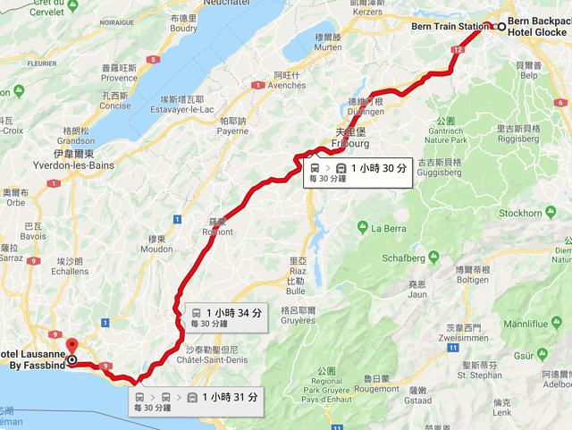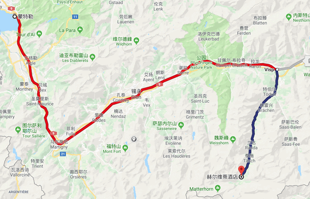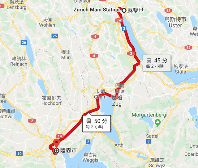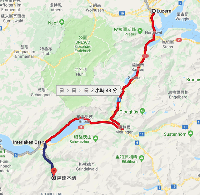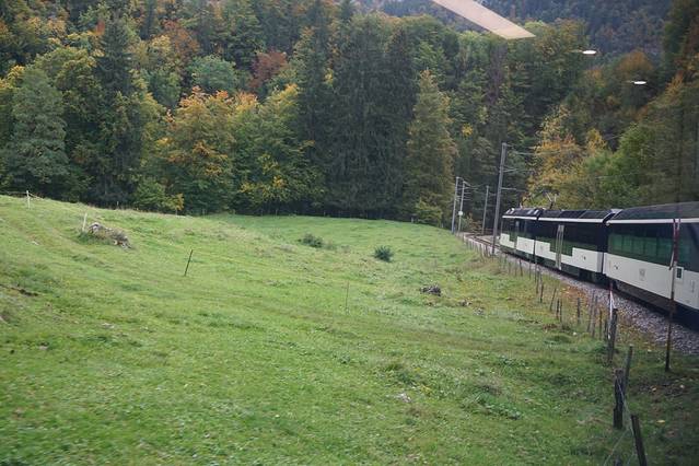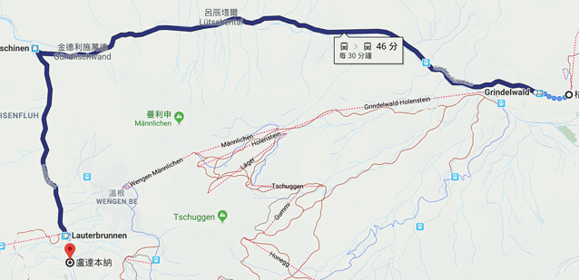 Google Map 已经失效,放出我的大招,这是火车上拍,你可以仔细看看到底怎么坐车。因为瑞士都是山,Google Map 的二维已经表现不出实际的距离和效果了~~
