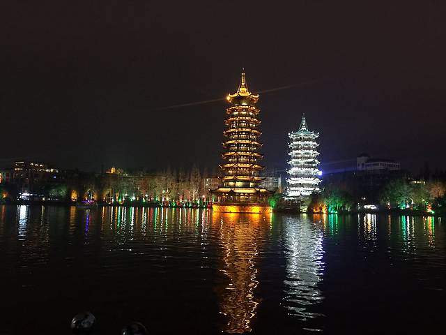 游两江四湖可以看看有名的日月塔,桂林日月塔又称金塔银塔、情侣塔;日塔别名叫金塔,月塔别名叫银塔,所以也有金银塔之称。日月双塔坐落在桂林市美丽的杉湖中,日塔为铜塔,位于湖中心,高41米,共9层,月塔为琉璃塔,高35米,共7层。两塔之间以湖底一条10米长的湖底隧道相连。因为发黄光的塔像太阳,发银光的塔像月亮,所以因此得名。
