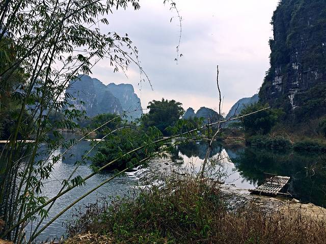 顺流而下,欣赏旁边的景色,真是舟在水中走,人在画中游,只是筏子的马达声音太大,再加上初春还是有些冷,坐四十多分钟的电动竹筏真是有些够劲儿,现在庆幸辛亏买的是到九马画山的票。