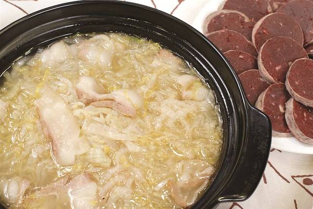 酸菜氽白肉是一道以酸菜、五花肉等为原料,精心煮制而成的吉林传统名菜,白肉肥而不腻,酸菜鲜香嫩脆,看似简单的一道传统汤菜,做法上的讲究却丝毫马虎不得。看着袅袅的热气,闻着酸酸的味道,足以令人沉醉其中。做到汤浓肉烂,菜酸入味才是此菜的精髓所在。