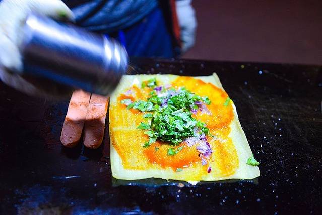 大饼是油锅里炸出来的,却不油腻,搭配独特香味的熏肉,清爽的黄瓜丝和大葱丝,颜色层层递进,口感也是层层递进,一口下去,别提多满足了。