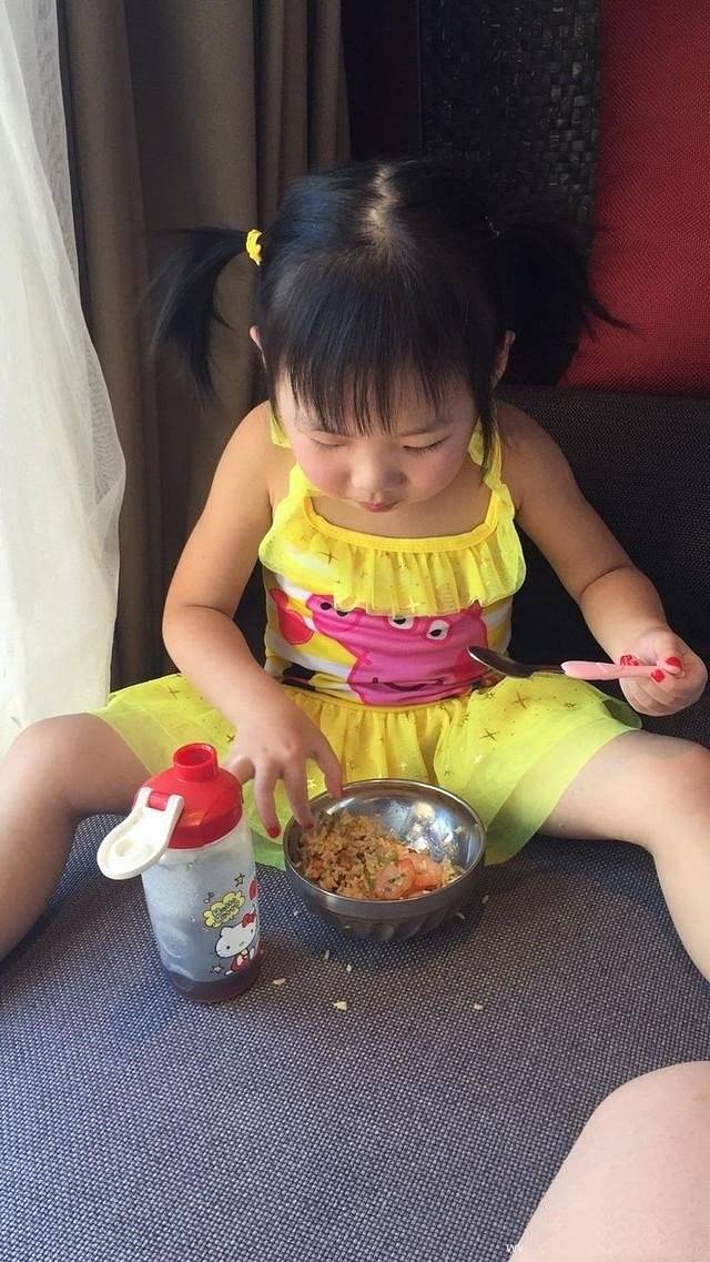 只可惜高大上的酒店附近并没有好吃的小吃,只能选择万能的美团外卖、送来水跟午餐、看果果的泳装照、吃午饭都不愿意脱、哈哈