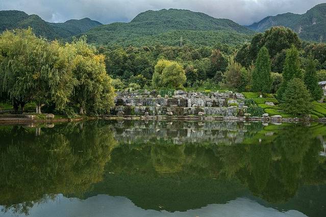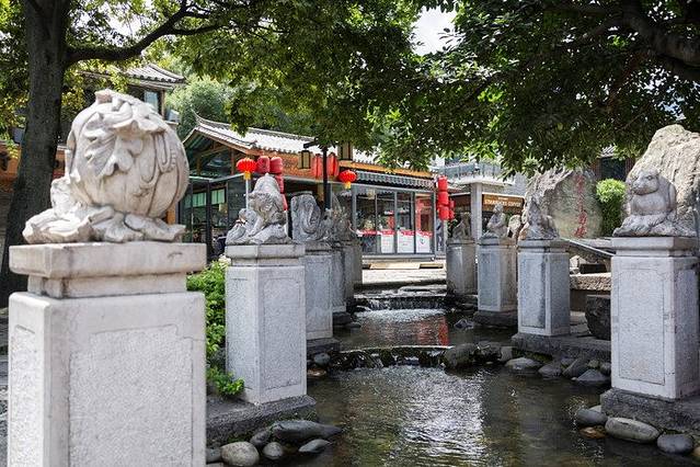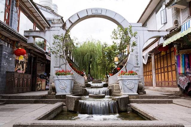 言归正传,水街正门是一个圆形的石门,背后一条水道据说是从苍山流下来,站在入口处便可看到苍山景色,很不错的一个画面;石门脚下以圆形平台为过渡,共汇聚了五个小水池,难道这就是传说中的五行归一?不过这"清泉石上流"的美景,还是很棒的,夏天过来玩下水,也算是一个清凉之所