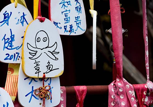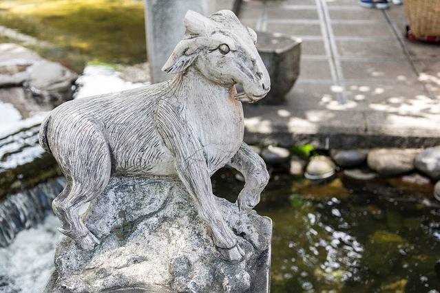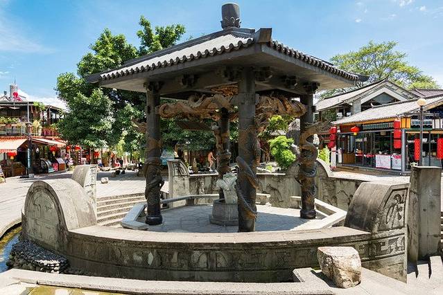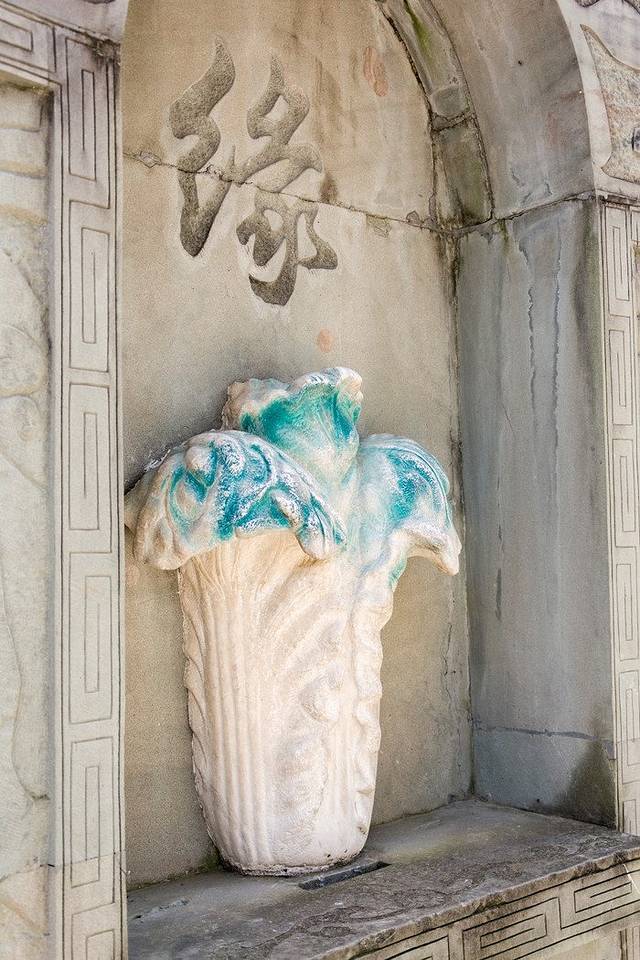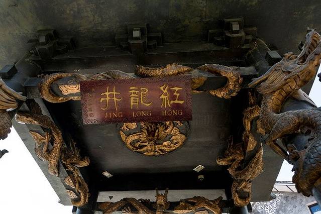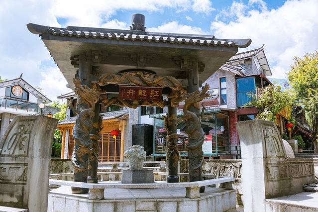 顺着水街上来,走过十二生肖雕塑群,便能看到中间的一个亭子,亭子四根柱子上分别缠着四条金龙,底下是一颗翠玉白菜,白菜下面才是井口。红龙井旁边有一家很漂亮的店,就是下面第一张照片。很喜欢这种花房子感觉,分享给大家~