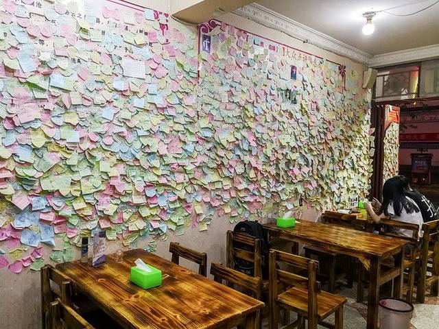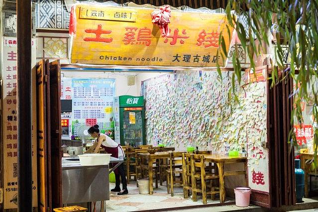 从博物馆出来时间已经不早,四处溜达了一下基本天也快黑了。这个时候当然需要找地方吃饭,我认为大理最好吃的东西除了黄焖鸡就是米线了,特别是土鸡米线,在网上看了一下,大家公认的大理最好吃了米线就要位于古城风花雪月大酒店旁边这个门的后方20米,这是一家很有年代感的老店,历史并没有留下太多的痕迹,反而这家店给人的感觉是比较潮流的,为什么这么说呢?因为店内进去的第一感觉不是米线店,而是来到了一个奶茶店。墙上贴满了便签纸,都是来来往往的游客写下的一些话,当然小孩子写的一般都是叉叉叉我爱你,叉叉叉我爱你,但大人写的大多是一些生活的感悟或者寄托~