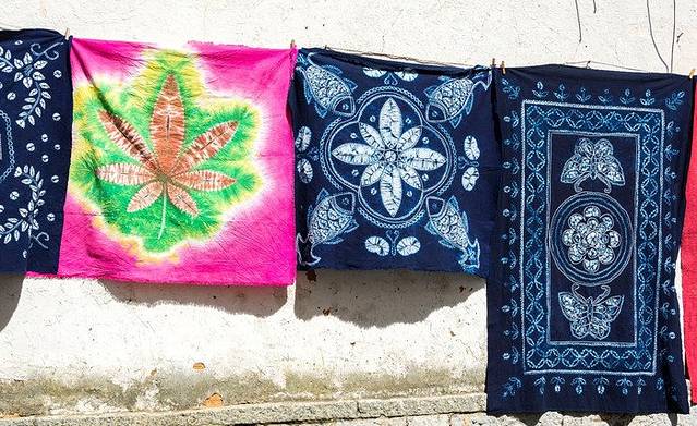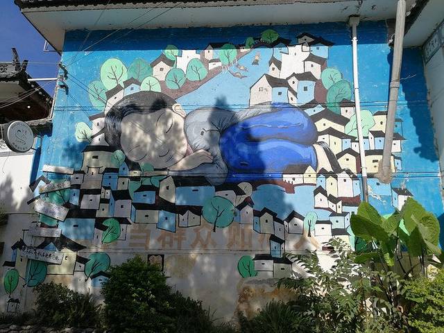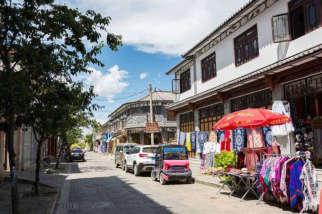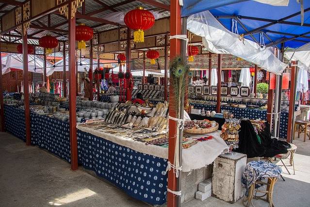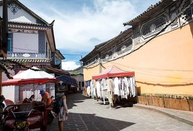 古镇上有很多卖特色布料的,就挂在建筑外的墙壁上,上面花纹很美,有喜欢的可以买一点带回去,价格比大理古城要便宜一些。
