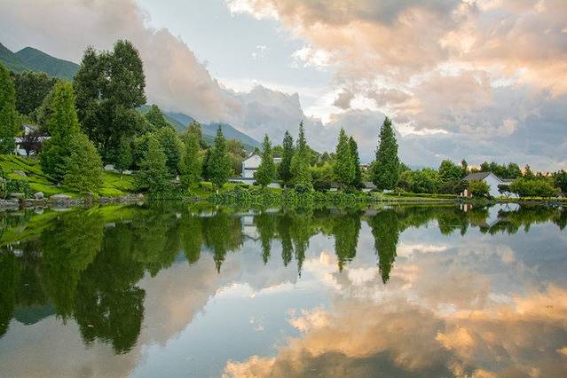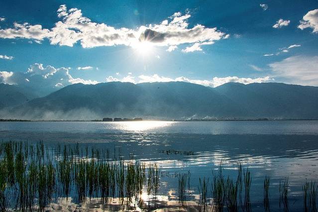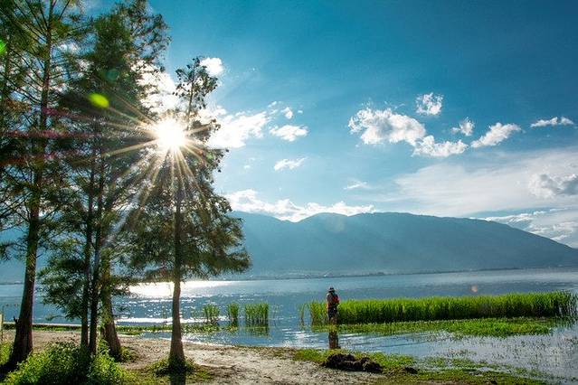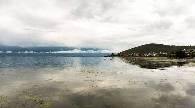 特别是靠近苍山这一面,苍山和绿树一起倒映在水面上,偶尔传来一阵湖边恋爱男女的笑声,空中飞过的 不知名小鸟,真是一个不错的地方~