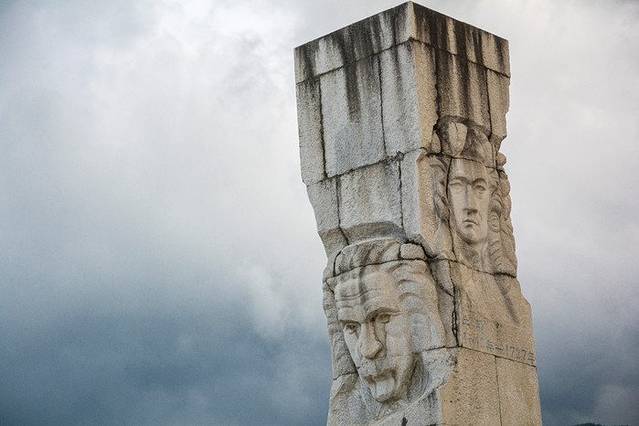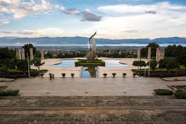 从台阶上来就看到了学校的校标,校标正上方便是学校的主教学楼,不过说起来,学校旁边竟然还有两排石柱,上面刻有名人的头像,这个倒是挺有特色的。等走到主教学楼门口的时候就可以俯视大理古城和远方的洱海了,说起来云南的天气的确很怪,苍山这一面乌云密布,然洱海这一边又是蓝天白云。想想大理大学的学子多么的幸福啊,每天打开窗户就能看到洱海,这一番风景,估计也只有厦门大学能够相比了吧?