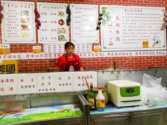 店铺面积不是很大,目测十平米左右,进门的左手边,占据了一半的位置,就是操作间,大家可以看着制作过程。这边煮米线的速度很快,基本上烫一下,两三分钟即可出锅,然后加上土鸡熬制的汤,和一些鸡肉块,好啦。