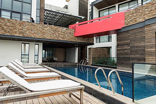 游泳池就在早餐厅的底下一层,面积虽然很小,但配合周边的设计看着感觉挺不错。再来之前看到官方照片上面有个大神拍的一张照片,把这个泳池拍出了无边际感觉,当然实际上效果的确是比照片差上一些,毕竟是照骗嘛,哈哈哈