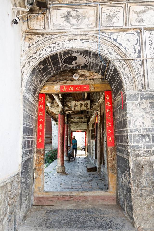 喜洲古镇的中心是四方街,貌似云南这边对于“四方街”这个名字比较钟爱,丽江的束河有四方街、大研古城有四方街,这里又有一个。四方街有一座石牌坊,不过是近年才新修的“文明坊”。原来的石坊叫“题名坊”,是明代镇上出了几位进士之后建的,那时候凡是在科举中取得功名的村民都可能性以把名字刻上,不过这些也只能从文字中看到,毕竟古迹早已不可寻。整个古镇就围着四方街这一圈往外建,镇外便是稻田,特别的漂亮~