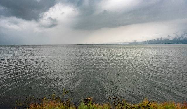 西岸的风景以苍山为主,海面的远方就是苍山脚下。偶尔一艘小船开过,构成一幅漂亮的山水画。但这边也有不好的地方便是太阳落山在这个方向,我来的时候已经四点钟,正是背光的时候,阳光刺眼拍照也没有办法。中间就没有什么景色了,唯一两个能看的就是舌尖的树和分界线上的路牌