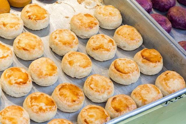 大理喜洲粑粑又名破酥,是一种色、香、味均佳的麦面烤饼,是大理城乡的一种风味小吃,以喜洲白族传统粑粑最为有名;主要原料为面粉,口味有甜、咸两种。制时皆用上下两层炭火,上层炭火为猛火,下层炭火为文火,在做好的面胚上刷上猪油之后入锅烘焙,在烤制过程中繁复刷几次油脂,烤香直至烤酥。喜洲粑粑外皮香酥而内在绵软,倍受人们喜爱,且层次分明,好看又好吃。加上放置时间也长,有些游客一买就是一纸箱,想买还不好买到呢~