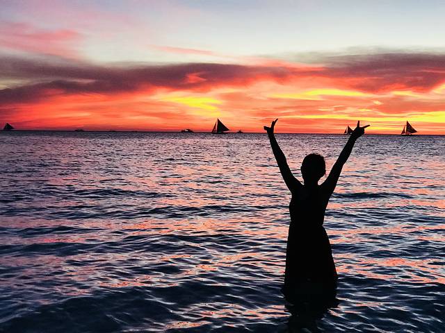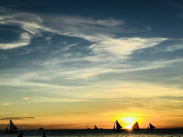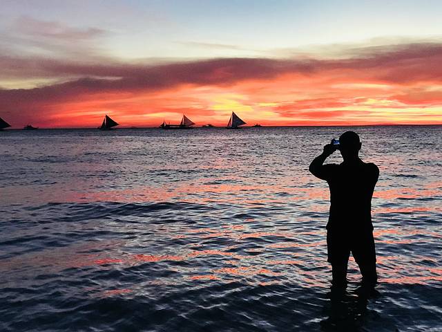 从山上下来竟然有回DMALL的免费班车,人品是不是好的爆。班车上和两个迪拜哥们聊的很嗨,他以为光哥是我粑粑,我说他眼神不错。他们去了马尼拉、巴拉望、最后一站来到长滩岛。他问我为什么长滩岛有这么多的中国人和韩国人?我直言:又近又便宜。他们还没去过中国,问了问中国游每天的花费,我给他讲的很详细,然鹅临下车这位迪拜王子也没有表示要带我回国……再见吧,一面之缘也是有缘的。回到海边正好赶上长滩风帆,并没有租帆船赏落日是因为我们都怕晕,而且晃来晃去的拍不出效果。长滩落日之所以有名,是因为它的海面向西北,毫无遮挡,夕阳西下晕染的天空每天都是不一样的美轮美奂。在岛上的这几天天气都不错,所以每天都能欣赏落日。能够出景的时间很短,大概也就是每晚6点到6点15左右,要拍大片凹造型的亲要注意别错过最佳时机哦。