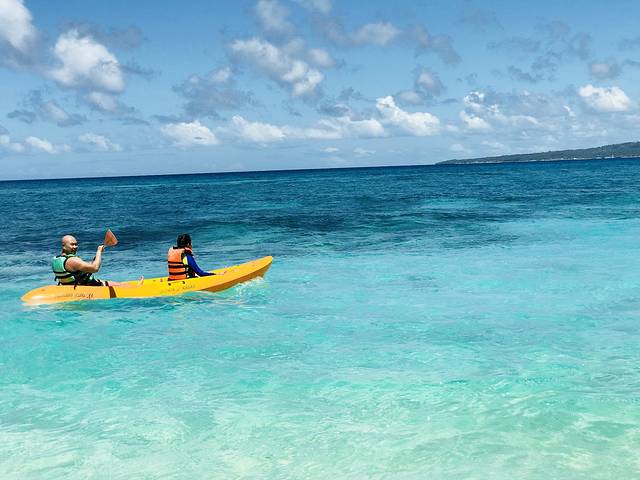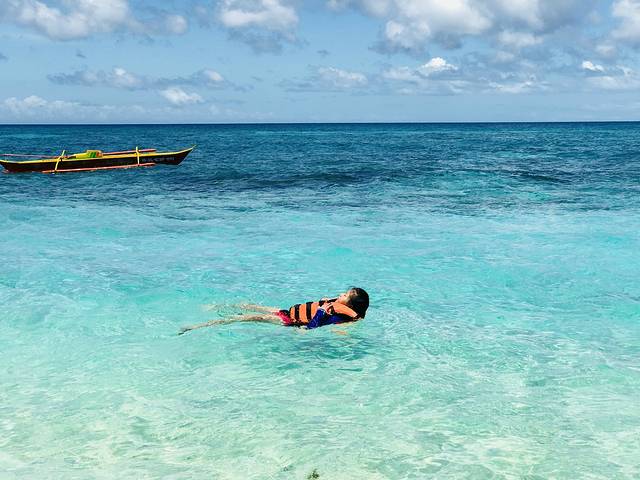 集中两天时间玩了所有计划内的项目,一天是市区、普卡海滩和卢霍山(MT.Luho)滑索,另一天是跳岛浮潜、水晶洞和拖曳伞。当地的出租车大家叫它TUTU,就是摩托焊一个挂斗,荷载五六七八个人,完全看体重和勇气,音效也的确是突突的。满街筒子的柴油味提醒你出行前最好戴口罩。我们先去了普卡海滩,就是梁静茹结婚的那片沙滩。优点是人少海绿、一杯冰沙(200P)包含沙滩椅、香蕉船、游泳圈等若干廉价小项目。缺点是沙质粗糙、沙滩不平缓,水深浪大。但是普卡的颜值绝对应该去领略一下。看似轻松的香蕉船也是说翻就翻的。讲真,陪畅姐玩世界还是要靠光哥的。