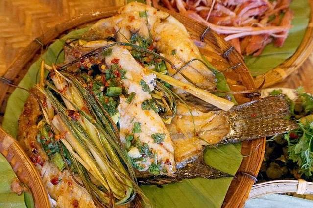 受西双版纳的地理气候和自然资源等条件的影响,傣族风味自成体系,基本的烹饪方法是烤、炸、蒸、剁、腌,很少炒菜;味道特点为香、脆、酸、辣、鲜。主要的风味食品有傣族的香茅草烤鱼、香茅草包蒸鸡、香竹烤饭、牛撒撇、烤牛皮、酸笋煮鸡、菠萝紫米饭、黄蚂蚁蛋、酸笋煮螺蛳、油炸青苔...