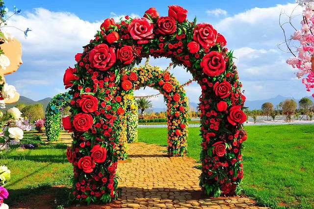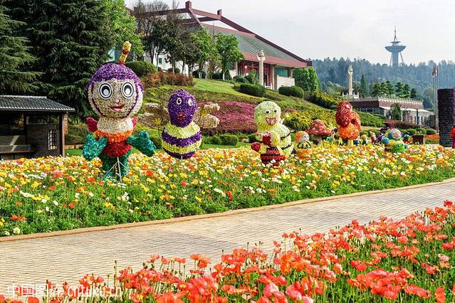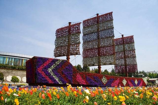 微风拂过,五彩缤纷的硕大花朵花浪翻滚,婀娜多姿,异常美丽。园内的建筑艺术和雕塑艺术融为一体,加上各国馆内、园外各种珍贵植物,花卉的装扮更把世博园衬托得五彩缤纷、耀眼夺目,更加完善,充分体现出人与自然和谐发展这一主题。