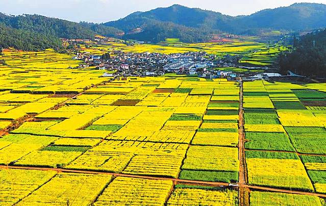 峨山县大龙潭乡至富良棚乡、塔甸镇公路沿线数万亩油菜花相继开放,把数十里长的大富塔公路打扮成靓丽的“宜游乡道”!满山的油菜花,正开得肆无忌惮:一朵朵成簇,一簇簇成枝,一枝枝花开,一田田金黄色;天上一片湛蓝,地面一片金黄,花色袭人,让人喘不过气来。伴随着油菜花海而来的,还有各地的养蜂人,带着花香的蜂蜜,绝对甜蜜到忧伤!
