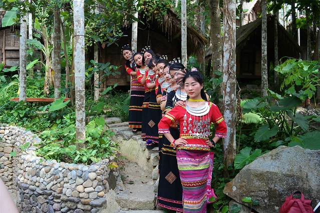 在这里,你可以看到所有的草房顶是独有的船形屋,黎族最后一代绣面纹身阿婆在门前织布、舂米。村内椰风摇曳,茅舍掩映,繁花似锦,院中秋千摇荡。我们也荡起秋千,身体并不那么轻松自如,毕竟那纯真的年代早已逝去。村边溪流轻淌,水车悠悠,炊烟袅袅,一切显得那么悠闲,一切那么自在,我们在这里寻找到梦的家园,享受淳淳风情,领略了黎族风情的活化石。一边拍一边看,看不尽这里奇山和秀水,当你置身这奇特的古村落并身临其境时,真可称得上海南岛的“香格里拉”,似人间仙境的“世外桃源”啊。