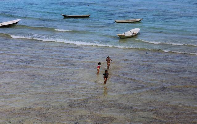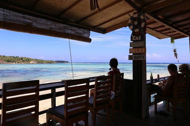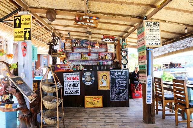 我们大约是十一点半左右到的,那时候店里还没什么人,我们顺利选了一个面海的吧台坐下来。这时候的海水的水位还比较浅,海滩中央还有三四支小木船搁浅在沙滩上。海滩上一直有一个当地的小女孩和一个小男孩在海滩上嬉戏玩水,他们一直企图跑到水海滩中央爬上那几艘搁浅的小船,海浪一扑上来,他们有嘻嘻哈哈地尖叫着跑开。后来又来了一个小女孩,三个孩子胆子越来越大,开始跑到水里扑腾,但同时海水也在涨潮中,原本搁浅的小船已经慢慢飘起来了,三个小孩子最终也没能走到小船上,但他们的欢笑声却点亮了整个海滩,这样的童年,真幸福。