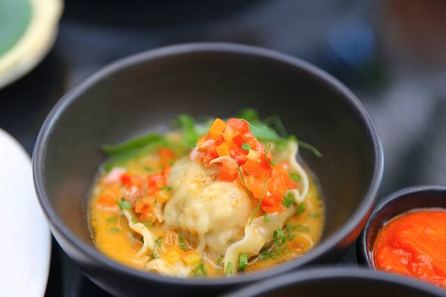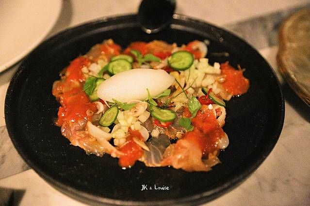 然后是前菜,生鱼片铺底,上吗有很多酱汁和香草调料,最上面放着一坨有点盐分的冰沙,吃的时候把他们全部拌匀来吃,鱼片入口冰凉清爽,味道浓郁有层次,偶尔咬到的香草料带了一股浓郁的东南亚的气息。