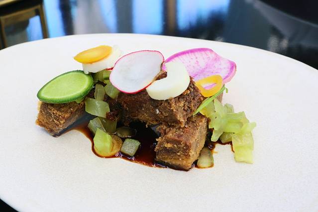 终于到主菜了,什么什么牛肉之类的,真的非常非常好吃!碟子里的所有东西都可以吃掉,最上面看起来像干掉的树叶和下面的一坨也需时土豆泥一样的东西配着这个牛肉真的特别特别好吃。牛肉也炖得恰到好处,柔软多汁又入味,满分。