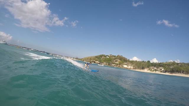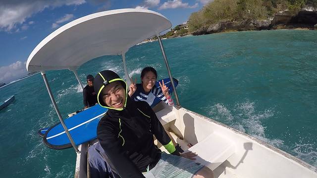 我们这次冲浪的地方是要带着冲浪板坐着小船开到离海岸稍微远一点的地方,那里的浪比较大。下了船我们就趴到冲浪板上开始往更深的海域划过去。我想说,光是划到起浪的地点我就累了!教练在前面带着我们,我们在后面卖力地跟着,到了起浪的地方,教练会推我们一把给个初速度,然后顺利站起来。说得是很简单,理论动作我都懂,但没力气啊!我们的教学用的冲浪板特别大,因为大板比较强容易保持平衡,容易站起来,所以滑水和加速真的特别特别费力。