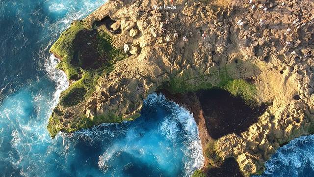 这里有两个低于悬崖的凹槽,每次打起来的大浪往这两个凹槽里填满了海水,而满到溢出的海水就顺着悬崖边像眼泪串珠一般往下落。而当我们的航拍器升空后,我和jk瞬间惊呆了。两个填满水的小凹槽就像是眼睛一般深邃,而溢出的海水就像眼泪一般金银剔透,双眼之间凸起的地方就像鼻梁,眼前的风景完全就是一张完整的恶魔脸呀!这才是真正的恶魔的眼泪啊