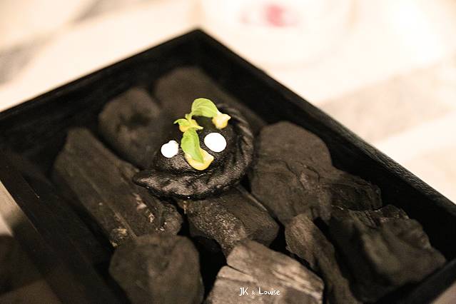 第二道小吃闪亮登场,是一支放在碳上面黑色的饺子,是的,只有一只。上菜的时候服务员还微笑着提醒我们说这里只能吃上吗的饺子哦,下面的碳是装饰不能吃的哦。我们看起来真的有这么饥不择食吗!但不得不说这个龙虾饺的味道真的不错