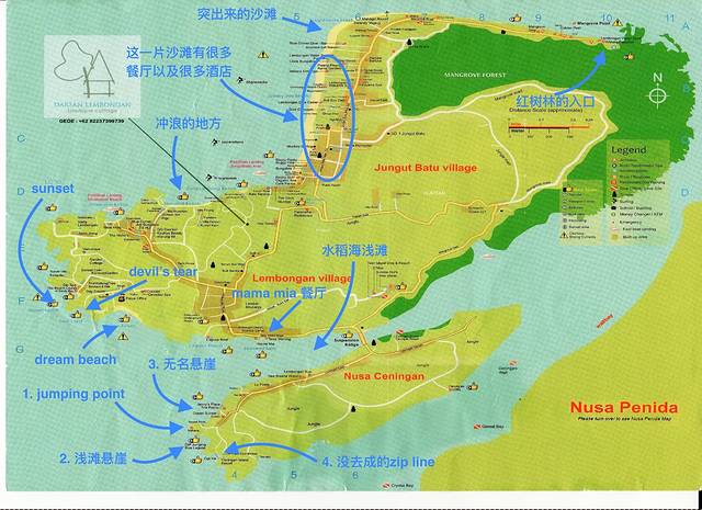 ,基本上一入住蓝梦岛酒店的第一件事,就是问老板租摩托车和要一份观光地图,今天下午要去的就是下图标注的三个地方
