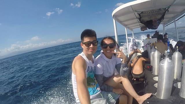为什么又要来一次巴厘岛,其实很大的原因是想来看潜水看molamola,也就是翻车鱼,这是种非常蠢萌脆弱的大鱼,喜欢寒冷的水域。蓝梦岛7到8月份的水温可以低至15度,所以有很大的机会可以看到翻车鱼,所以7到8月份可以说是巴厘岛的潜水旺季。可惜我们潜水的那几天大约是因为水温不够低,最低大约也就23度左右,虽然对我来说已经是冻到爆了,穿着5mm厚的湿衣都不太够,但对于翻车鱼来说这还不够冷,所以潜了两天都没看见翻车鱼,遗憾极了!