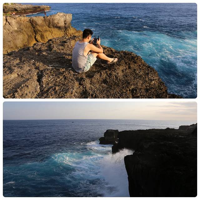 jk专心控制spark的工作照。这里有个小插曲,事情是这样的,由于风景太过美丽,jk忽略了系统的低电量提醒也取消了系统自动返航的操作,想要更多的拍摄这里的美景,结果spark直接在一分钟后闹脾气了,直接强制视觉降落,直接下降!所谓的视觉降落就是在飞行器快没电的时候自己找一片比较空旷的地面降低高度直到落地,但是我们的机器是在海面上,这不是要直接坠海的节奏嘛!此刻spark已经是完全不受遥控器控制了,一直要往下降。jk急的开始一通乱按,希望夺回对飞行器的控制权,结果也不知道是乱按成功还是飞行器自己视觉识别出下面是大海,它悬停在了海面五六米的高度上,此刻jk不顾一切地把控制spark往回飞,只要能飞回路面,就算炸机了也有找回来的机会啊。最终spark在还剩下3%的电量的时候安全着陆。