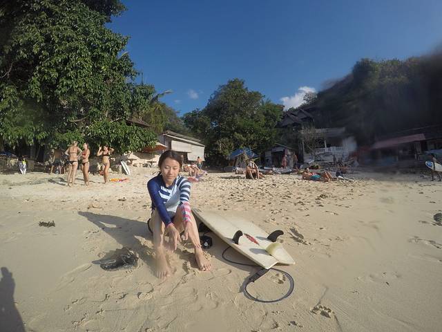 蓝梦岛的海滩上有很多冲浪学校,如果你是打算进行下一个三天的冲浪系统课程,可以选一个好一点等我潜水学校并提前预定。但我想大多数人应该都跟我们一样,没有那么充裕的时间,那么其实随便找一家冲浪小店就可以了。我们这次选择了一家在 海滩上的小店,这海滩离我们酒店很近,于是我们也没有过多的纠结。店老板就是我们的冲浪教练,两个人两小时大约300元。