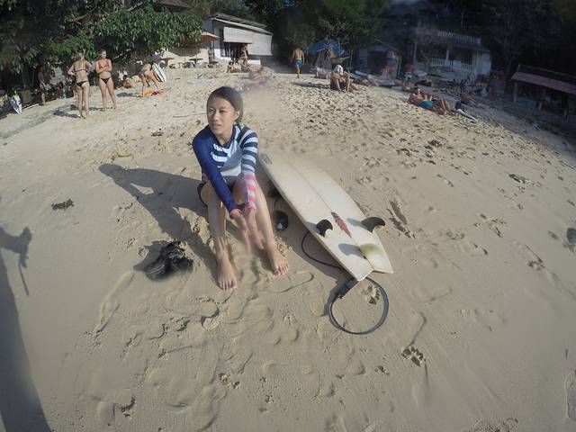 因为上回有过从冲浪的学习经验,所以我和jk一开始都几乎是顺利地站起来了。但冲了四五次之后,我就彻底没有力气了,因为每次冲到浅水区,还要自己趴在冲浪板上划回去,女生很容易体力不支。而且到了后面,教练训练我们起浪的时候自己调节角度并且自己划水加速,对于我来说更是体力上的挑战,以至于到了最后,只能默默地坐在冲浪板上看着jk愉快地装逼.