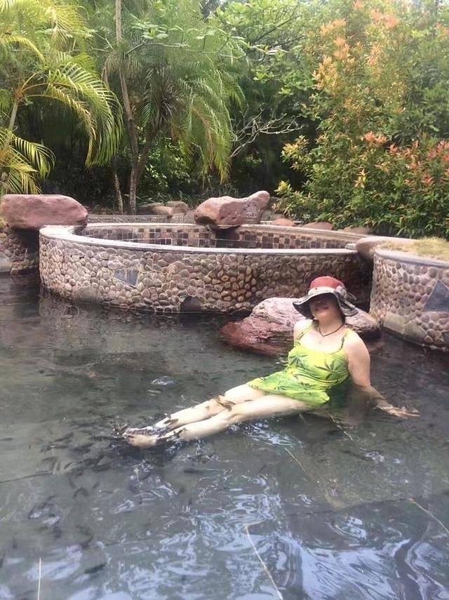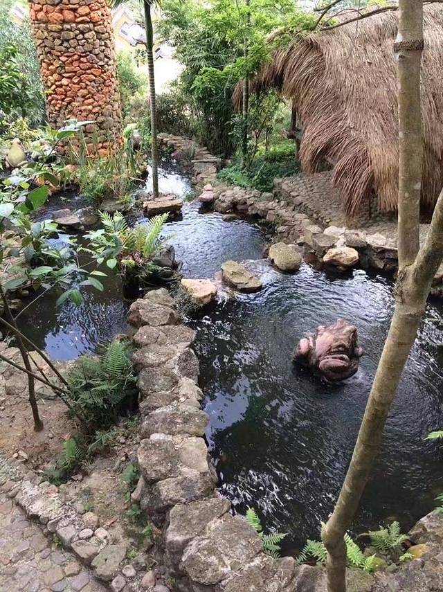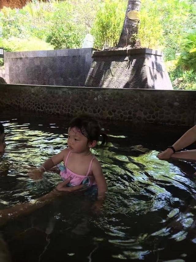 温泉区的自然环境很不错,到处是热带植物,很有东南亚风情。温泉有60多个,有很多都藏在茂密的植被里,如果不仔细看还不容易发现呢。布兜一开始有点怕,不一会就适应了,还想游泳呢。