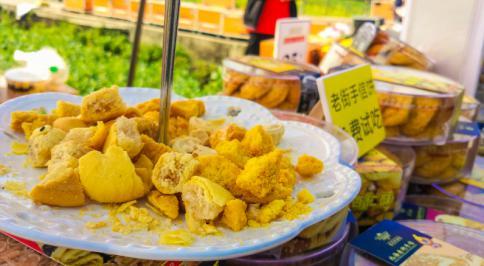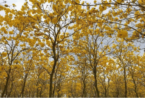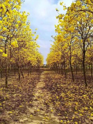 合浦县常乐镇莲南村委滩头村,3000多株黄花风铃盛开,嫩黄花朵随风摇曳,满园尽是黄金甲十分壮观。而其花冠成漏斗形,远远看过去就像一只可爱的风铃,因此被称为黄花风铃。此时,风铃花纷纷落下,我们踏着这条金黄的路别提有多诗意了。可惜我肚子里墨水不够,半天想不出来。想不出来就算啦,赏美景才是最重要的。