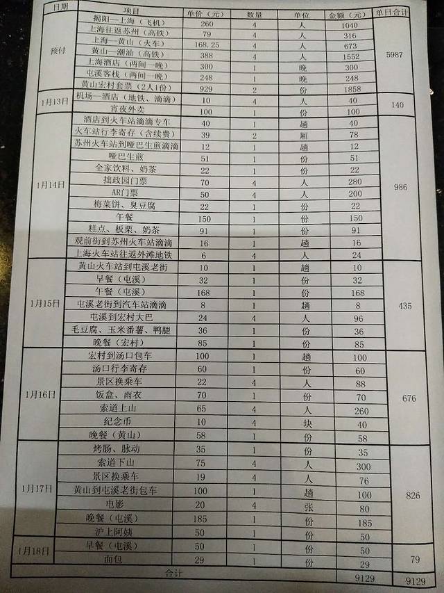 费用说明:我们四个人,全程下来,一共花费9129元,平均一人还不到2300元。