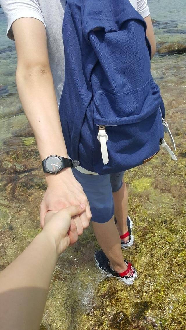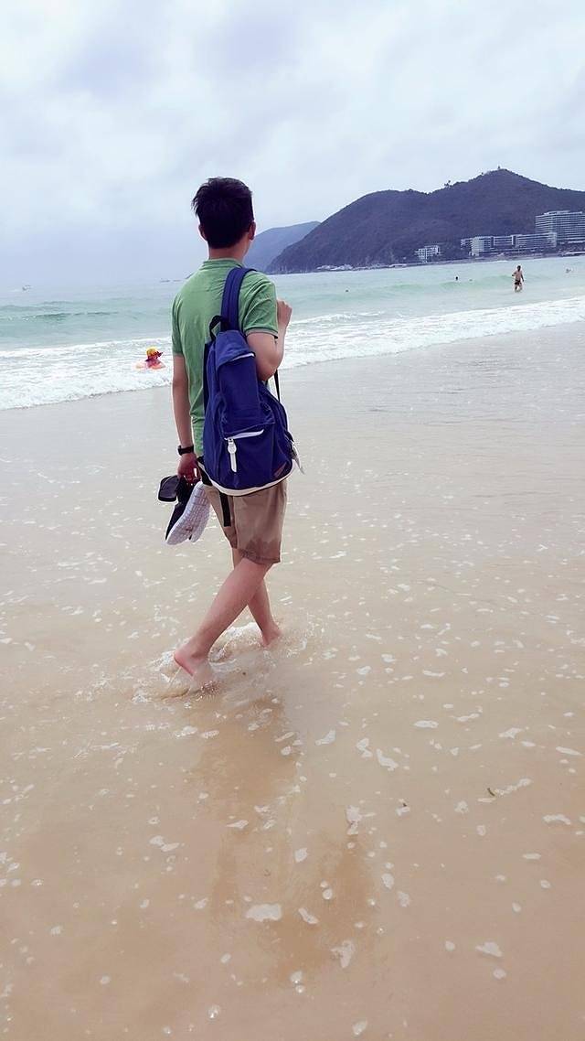 大东海的沙不是很细,但是海水质量海水可以,很多人在海里游泳,我们沿着海岸线一直走。