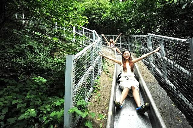 相比滑草的一泻千里,滑道的弯曲多变似乎更多了些惊喜和意外。大理石砌就的滑道在山间绿荫处蜿蜒起伏,本以为可以清闲的闻闻花香,听听鸟语,哪知道身体随着滑道的弯曲不停的变换着姿势,就好像骑上了一匹脱僵奔腾的野马,时而飞奔向前,时而放慢步伐,总让你猝不及防,又惊喜不断。