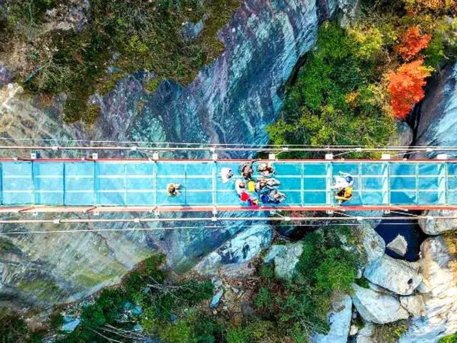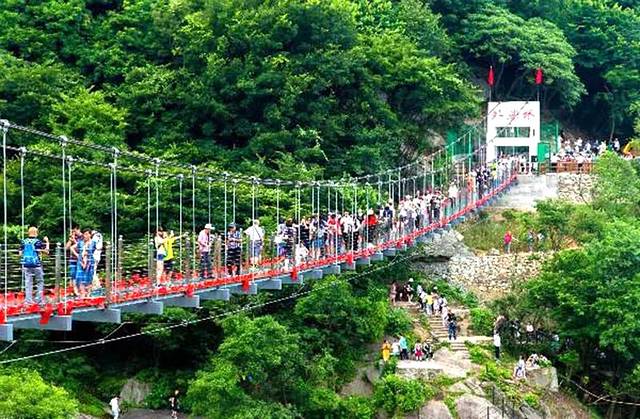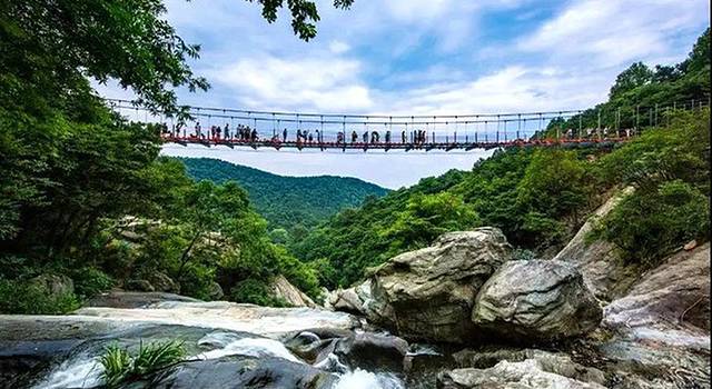 刚开始还不敢看四周,只扶着一旁的栏杆缓缓行进。听到前面游人的呼喊和手机拍照的声音,欢笑声似乎让紧张的气氛渐渐缓和了下来。我慢慢移动目光,才看到对面满山绿树葱茏,天空碧蓝明净。走到桥中段,往脚下一看,奇石怪峡,山谷溪流,大自然最本真的面貌全然呈现在你眼前,让你不得不感叹人的渺小。很多时候,我们不知道自己的极限在哪里,不是因为做不到,而是因为连迈出第一步的勇气都没有。