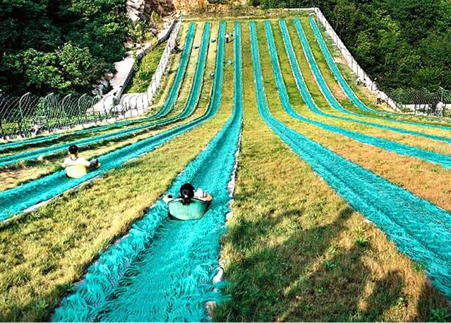 走到斜斜的坡地,一条条狭窄的绿色滑道蜿蜒而下,好像一帘帘碧绿下泻的飞瀑一般。坐在帆布滑坐垫上,还没来得及缓过神来,“咻”的一下,就往草坡下冲,连尖叫声都比风声跑的要快。