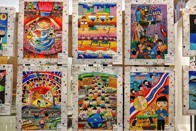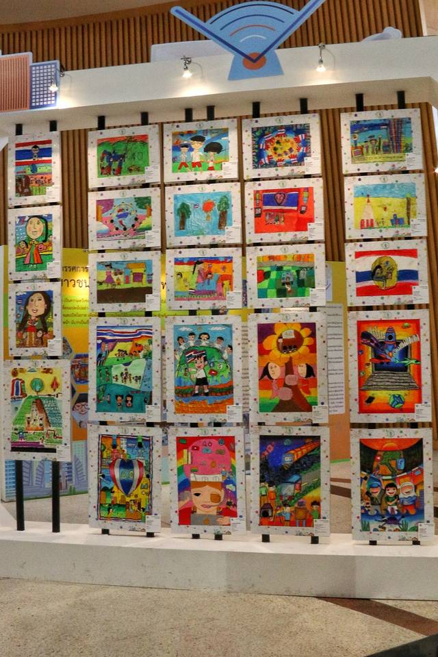 一楼是小朋友的绘画作品,色彩艳丽。