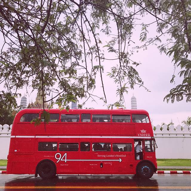 来时突降暴雨,伞都挡不住,我俩依偎在小树下避雨,看着对街的大皇宫,停着一辆好看的红色巴士,不顾半身湿透 拍下了它