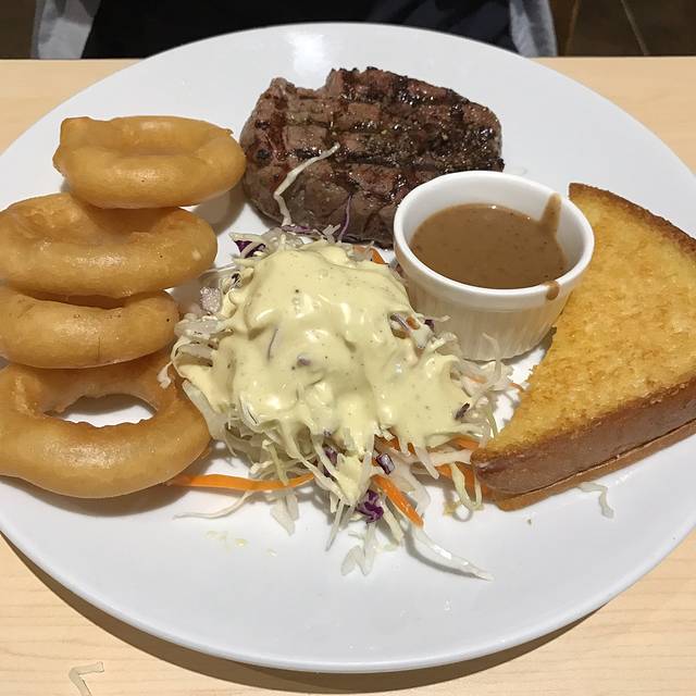 早上收拾行李,午饭就到BTS站旁一个商场解决,本来打算去之前几次遇到没吃的Shabushi,但是评价一般于是选了排满泰国人的Eat Am Are餐厅取号,600฿点了两份牛排,呆霖说沙拉好吃,看着不多吃起来很饱,洋葱圈里面真的有洋葱,薯条是我喜欢的粗薯,柠檬茶好喝又解腻