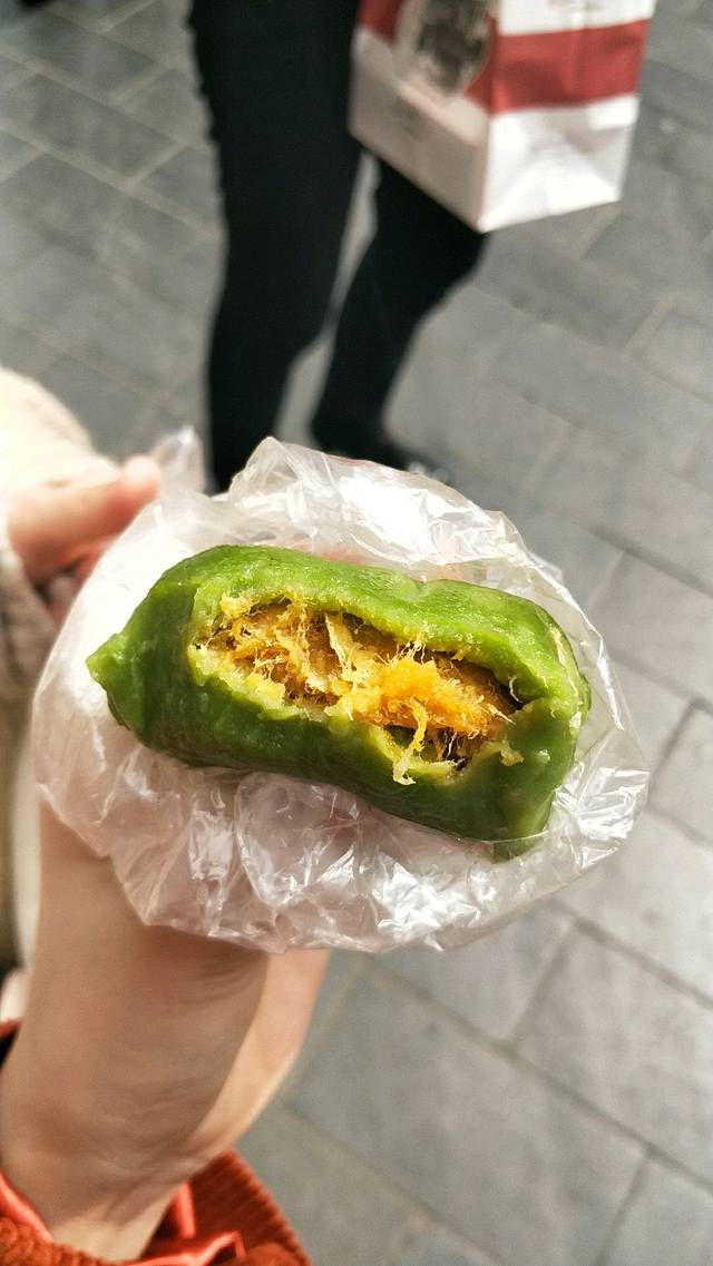 ❗❗顺着人潮,看见了好多人排队的沈大成青团,不知道这家是否是去年大家炒的很火的青团店呢,跟着风也去排队起来,价格不贵,缺点就是卖东西的大姐速度实在是太慢了,(青团价格大概只记得两种的价格,豆沙青团3元一个、蛋黄肉松青团8元一个)各买了一个,首先说下豆沙青团个人和小伙伴们觉得太甜了,不喜欢,更偏向于喜欢蛋黄肉松的,外皮有米香的味道,肉松不是那种让你觉得很廉价咸而松散的肉松,路过的小伙伴可以去买个试吃下哦。(❗位置位于南京路步行街靠近佐丹奴专卖店的十字路口)